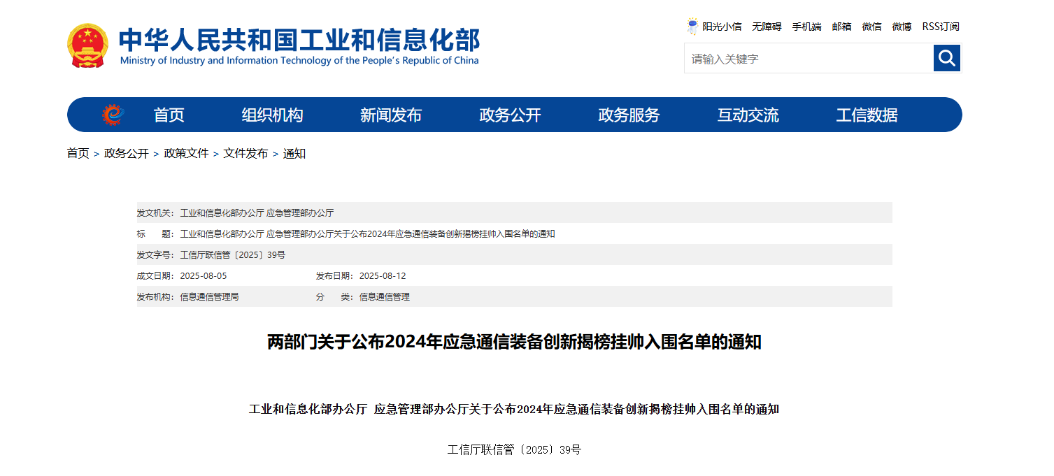 內容來源于兩部門關于公布2024年應急通信裝備創新揭榜掛帥入圍名單的通知